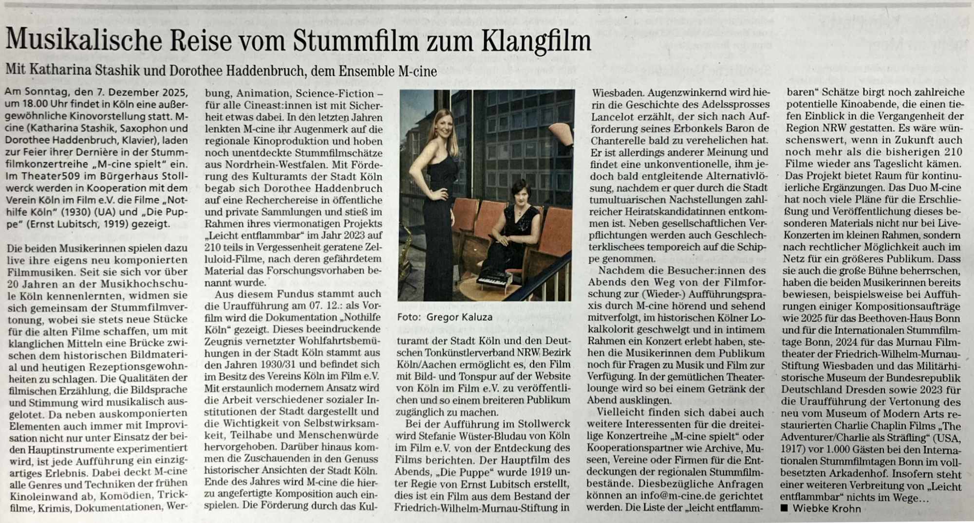 „Im vollständig besetzten Saal wurde der Stummfilm sehr einfallsreich, gefühlvoll und auch ironisch vom Kölner [Duo Haddenbruch / Stashik] mit Klavier- und Saxophonmusik begleitet.“